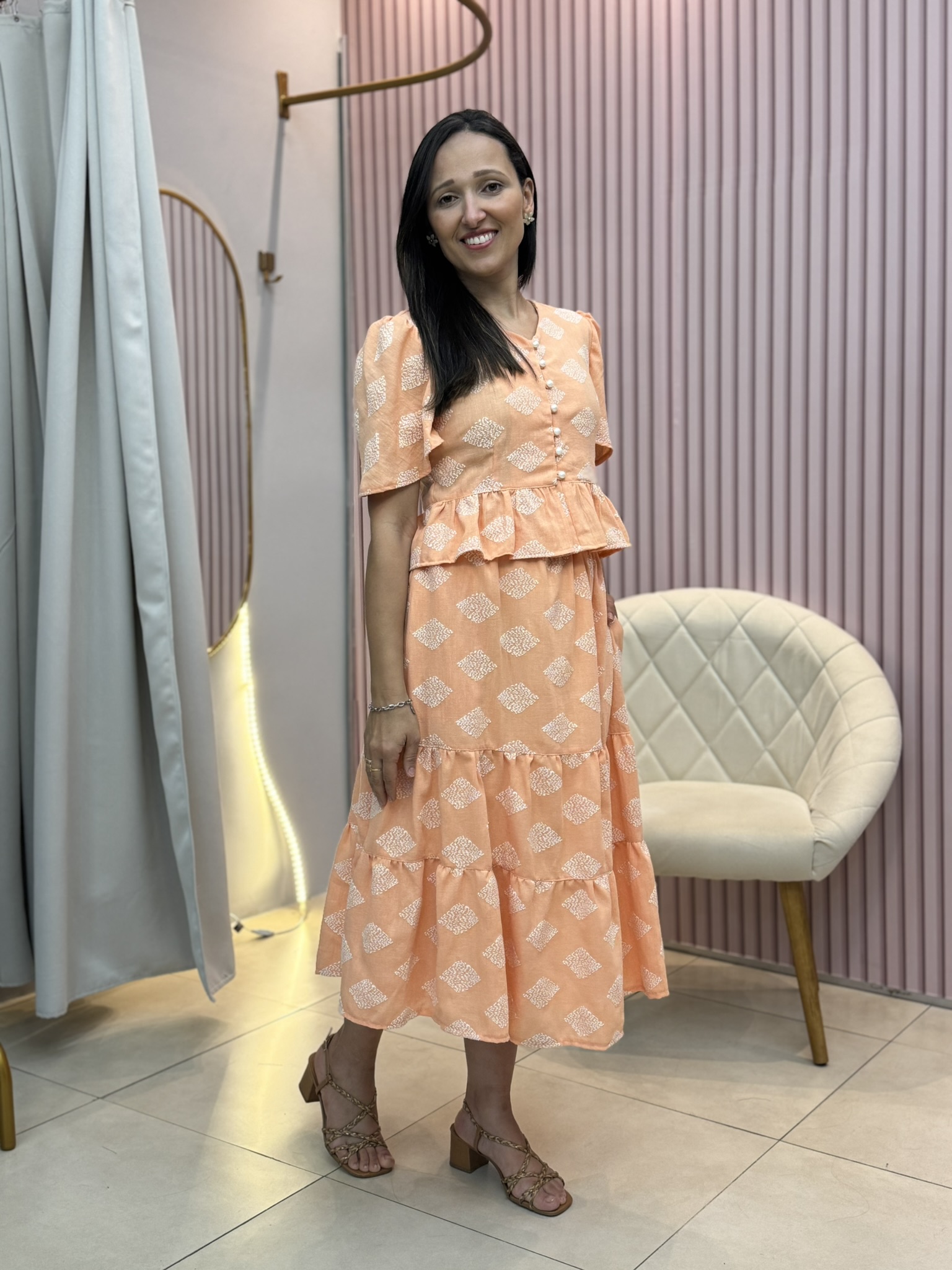 A saia midi é fluida, com recorte em camadas