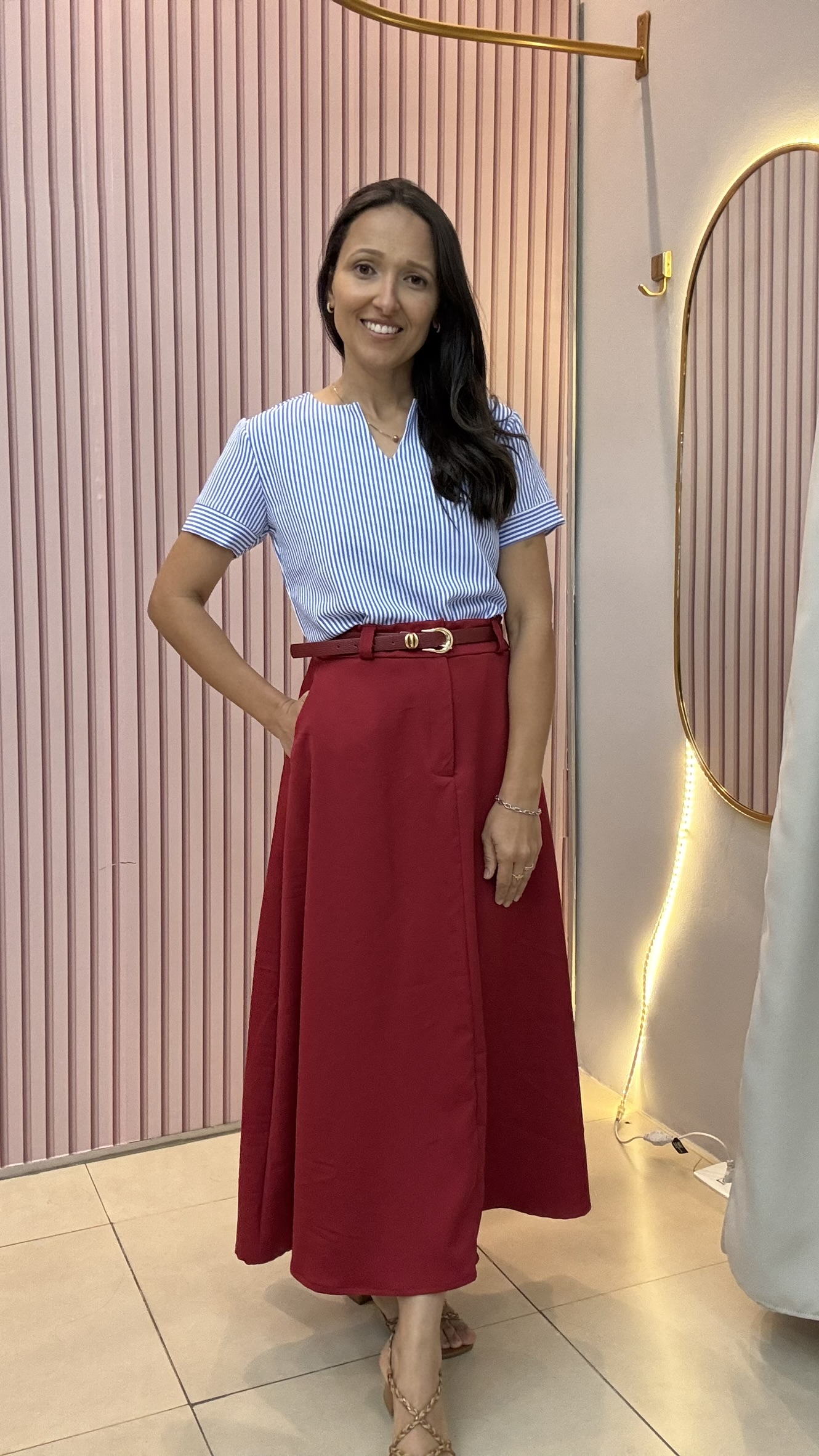 Versátil, ela combina perfeitamente com saias, saias midi,