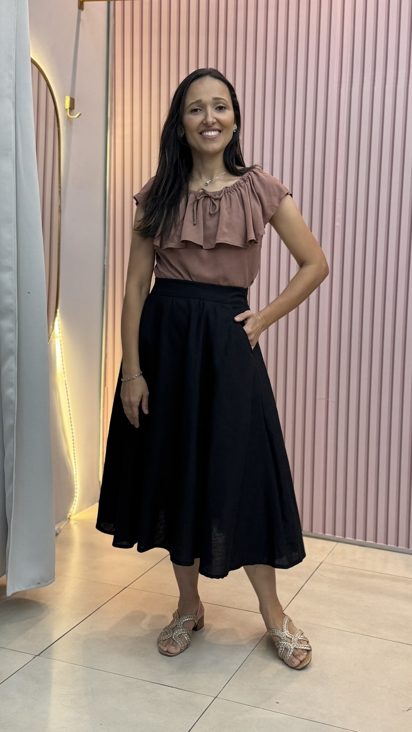 Saia midi, confeccionada em linho misto que traz um